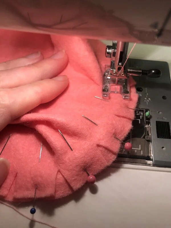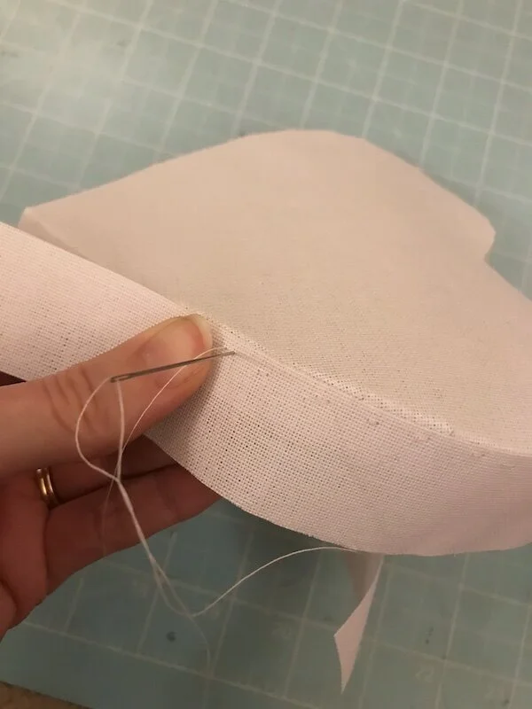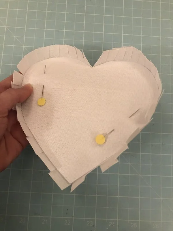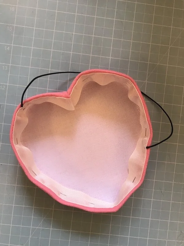 Seam the ends of the outer fabric band together. Find the centre point and clip into the seam allowance (this will be positioned at the bottom V-point). Pin the band around the heart, clipping the seam allowance around the curves to fit. At the point of the V, pivot the band on the cut you made, to turn the corner of the V. Stitch all the way around the crown, then trim the seam allowances down to about 1/8” / 3mm.
