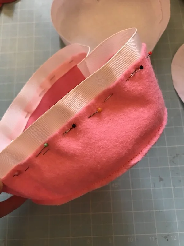 Cut your grosgrain ribbon to the same length as the band (with seam allowance). Without turning the crown right side out, pin the grosgrain band to the inside (i.e. the outside when it’s turned the right way round) of the band, overlapping by about 3/8” / 1cm.