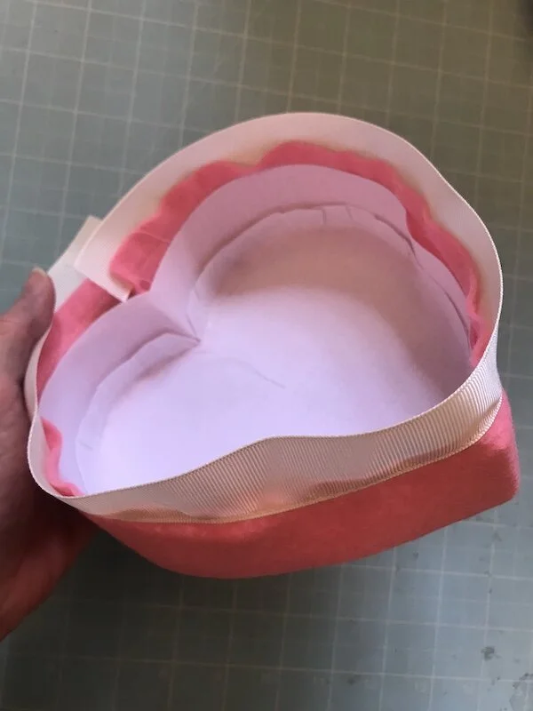 Next, take your buckram band. Crease the band in the centre (this will be the V-point of the bottom of the heart). Then, with the flat edge at the top and starting at the V-notch at the top, hand stitch or glue the band in place, making sure the tabs of the top crown are neatly folded in.